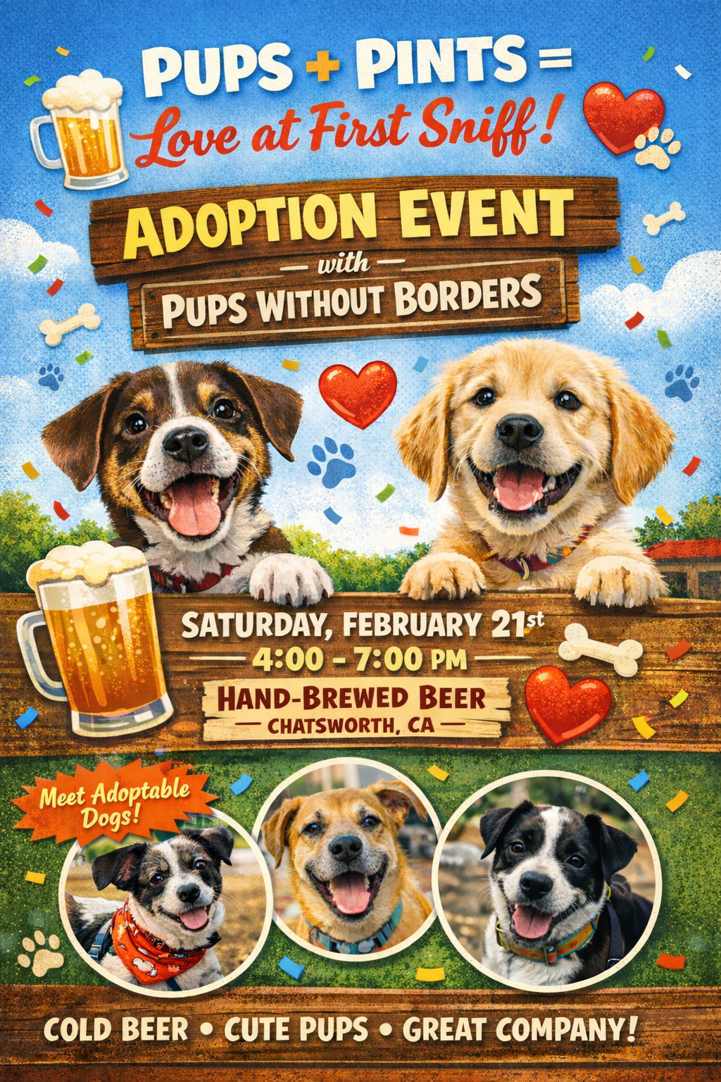 Come sip, socialize, and maybe meet your new best friend at our Pups Without Borders Adoption Event at Hand-Brewed Beer! Join us on Saturday, February 21st from 4–7 PM for an afternoon filled with cold craft beer, wagging tails, and adoptable pups ready to steal your heart. Whether you’re actively looking to adopt, thinking about fostering, or just want to cuddle some dogs while enjoying a brew, this is the perfect chance to hang out with fellow dog lovers and support an incredible cause. Come for the beer, stay for the puppies — you never know who you might fall in love with 🐶🍺💛