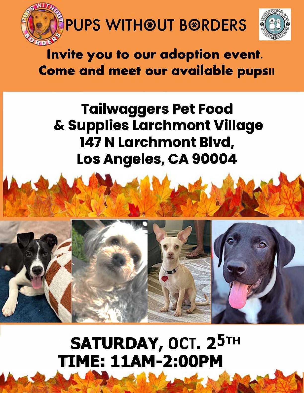 Since opening their doors in 2003, Tailwaggers has endeavored to provide the highest quality food and pet supplies, always making sure to source products guaranteed to make sure your doggo is as happy as possible! Now, Tailwaggers is partnering with Pups Without Borders for an adoption event like no other! Join us at the Tailwaggers Larchmont Village location for a day of puppies and sunshine! We hope to see you there.